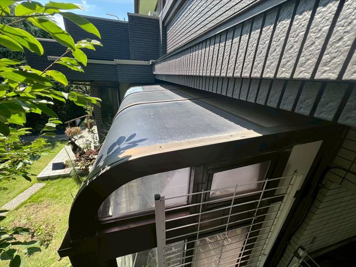 まず、気になったのが、屋根に葺かれている瓦です。こちらはセメント瓦のモニエルといって、現在製造が中止されており、この種類の瓦は廃盤となっております。また、塗装が必要な瓦ではありますが、塗装の仕方も独特で、表面のスリラー層を確りと除去した後に、セメント瓦専用の塗料で塗装を行います。扱いを間違えると、早い段階で表面が剥がれてしまいます。また、廃盤により在庫がないので調査中や工事中に割ってしまった時の替えがございません。割れた際に補修で対処できるならいいのですが、セメントなので、場合によってはガャシガシャに割れてしまうことも十分に考えられます。取り扱うにはリスクが高い屋根材と心得ておく必要がございます。