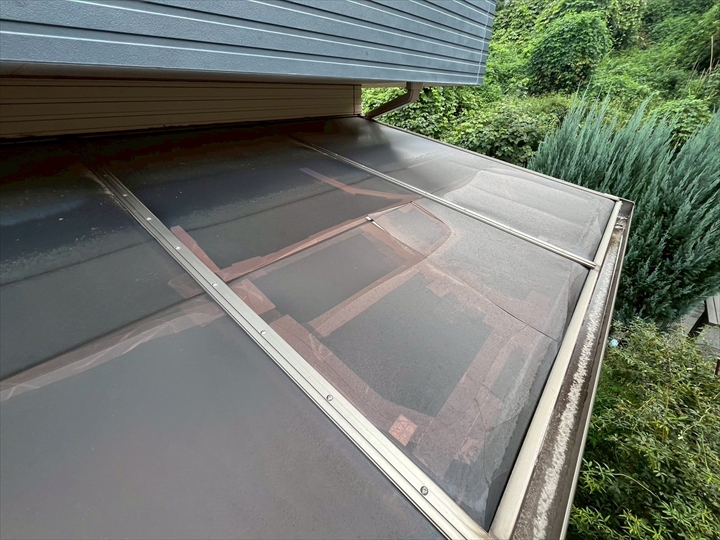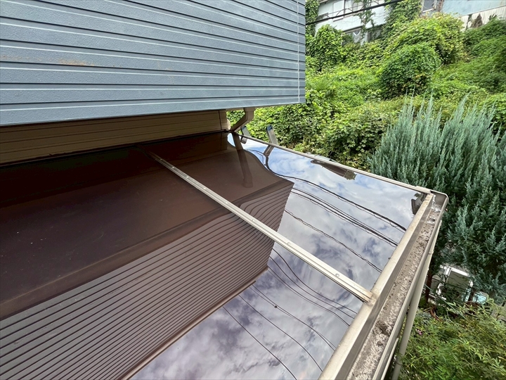 外壁のサイディング目地のコーキングも劣化してヒビ割れていました。ここも雨水の侵入経路になります。下屋のスレート屋根は塗装工事をした事はないので、縁切りの必要性はありませんが、外壁から流れ込んだ雨水がスレートの裏側に回り込んで、防水紙の切れ目や固定する釘のまわりから雨漏りしてしまう事もあります。全体をみさせて頂いて、必ずやらなければいけない工事は防水工事とコーキング工事です。コーキングはサイディングの目地だけでなくサッシ周りや防水の立上り、笠木のジョイントなど細かなところも打っておかないとダメでしょう。雨漏りは原因をしっかりと突き止めて適切な工事をおこなわないと止まりませんので、注意が必要です。