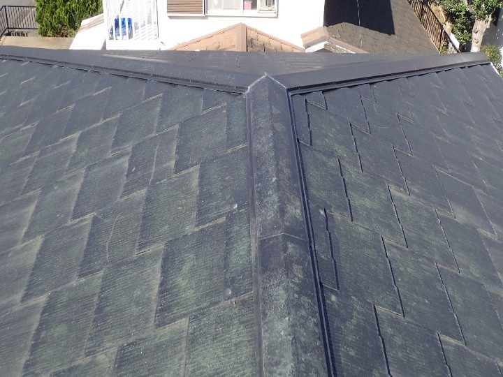 屋根に上がらせていただき、スレートの状態を確認していきます。スレートは防水機能が低下して汚れが付着し、屋根全体が滑りやすくなっておりました。特に雨水の溜まりやすい谷部分にはカビや苔が繁殖しており、表面の塗膜がかなり劣化しています。常日頃から紫外線や雨水を受けるスレートは新築から7年を過ぎたあたりで塗装を行い、新たに防水機能を復活させるのがお勧めとなります。