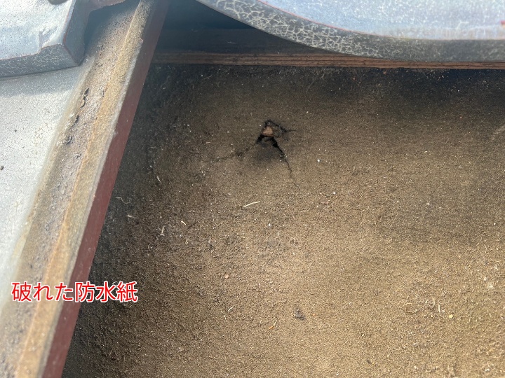 棟板金は屋根のてっぺんに取り付けられた板金カバーですが、屋根の中で一番劣化が早い部分なので注意が必要です。今回の屋根でも釘の浮きや棟板金の浮きが確認できました。直ぐには被害は出ないですが、台風などの際に剥がれて飛んで行ってしまう可能性もあります。屋根そのものの傷みも見受けられたので、板金のみ交換というよりは屋根全体をカバー工事や葺き替え工事でメンテナンスする方向性がオススメといえる状態でした。