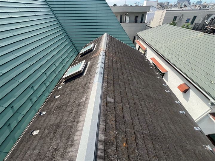 スレート屋根の屋根です。傷みの具合は見た目以上に酷い状態です。勾配が緩いので雨が降っても上手く雨水が流れていません。特に表面が劣化しているのでスレートが雨水を吸ってしまい、スレートの傷みを進める要因になっていました。屋根葺き替えのご提案をする場合には、二つの状態があります。一つ目は、スレート自体の反りです。先ほども言いましたが、傷んでくると雨が降るたびに水を吸ってしまいます。そうすると天気が良くなって乾燥が始まった場合には、表面と裏側の乾燥度合いに差が出てしまい、結果的に上向きに反ってしまう事になります。反ってしまったスレートは、塗装工事をしても反りが戻るわけではありませんので、屋根葺き替えが必要です。もう一つは、屋根下地の傷み具合です。スレートの傷みだけでしたら、金属屋根を上から被せるカバー工事も可能ですが、野地板が傷んでいると屋根を固定しようとしても止めることが出来ません。また、野地板の傷みは殆どが雨漏りが原因ですので、傷んだ野地板を交換しないと雨で濡れた部分にカビが生えたりと、建物へ悪影響を及ぼす場合があります。この様に、屋根葺き替えかどうかの基準は野地板ということです。