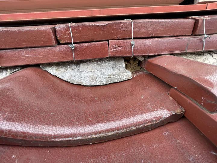 漆喰であれば通常10年~15年でメンテナンスが必要な箇所なのです。点検をさせていただき剥がれやひび割れなどが確認できた場合は、劣化した漆喰を取り除き、詰め直します。銅線も遊びが出ないよう結び直します。