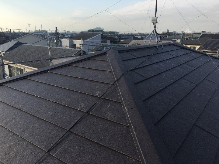 屋根の上で板金を加工する作業が減ることになりますので、屋根の上では取付けや固定という作業がメインとなり、現場での作業時間や雨に降られるリスクも減ることになります。アスファルトシングルの上にガルバリウム鋼板製の立平葺きを行う屋根カバー工事が終わりました。色はギングロと呼ばれる黒色と銀色の中間色です。屋根が変わるだけでも建物の印象はかなり変わります。この度はご利用いただきまして、誠にありがとうございました。