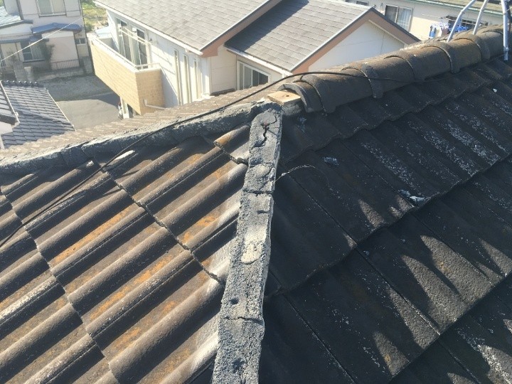 葉山町一色S様のお宅にお伺いして、まずは屋根に上がらせていただきました。使用されている屋根材は、すでに生産中止となっているかわらUと呼ばれていた屋根材でした。棟に使用されている部材が屋根の上に散乱しておりました。