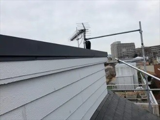 屋根の内部を喚起するためにあえて隙間を開けてあるのです。アンテナが取り付けてありますが、棟板金交換工事ではアンテナを浮かしながら作業することが可能ですので、アンテナが建てられていても問題はございません。