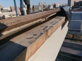 実際に屋根に上ってみると、ドローンで撮影したときよりも棟板金が無くなって露出した貫板が黒くなっておりました。これは露出して雨ざらしになってしまったことが原因です。木材は雨ざらしになると傷むのがとても速くなります。