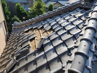 特に袖瓦部分では釘打ち箇所が確認され、釘頭に施された既存のシーリングは経年による劣化症状が見受けられました。
