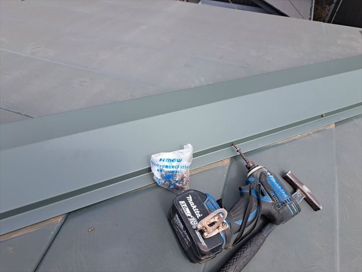 先ほど設置した樹脂製の心木下地にビス止めすることで、棟全体の固定力が向上し、耐風性や耐久性の強化につながります。
