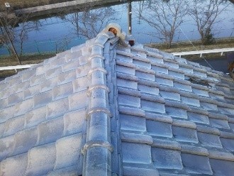 棟瓦が一部飛散しており、下地の貫板が露出している状態でした。